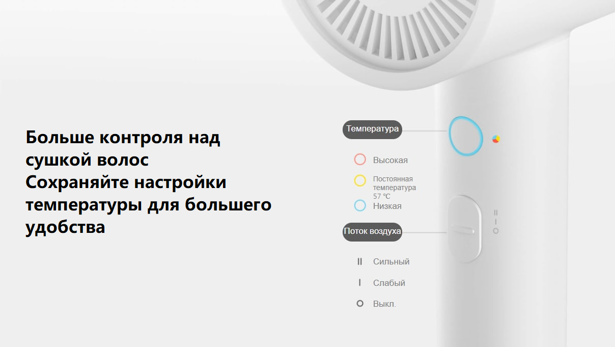 Позволяет свободно переключаться между горячим и холодным воздухом и лучше контролировать скорость воздушного потока. Просто включите фен и выбирайте из трех настроек температуры для комфортного воздушного потока. Используемая температура будет автоматически сохранена и включена при следующем использовании.