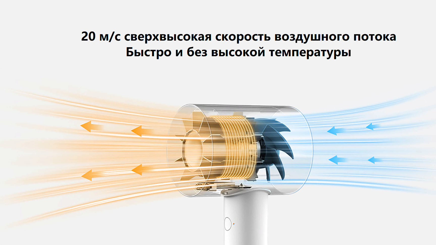 Вдохновленный принципом авиационных двигателей, Xiaomi Water Ionic Hair Dryer H500 оснащен высокоскоростным двигателем постоянного тока со скоростью 20 000 об/мин и семью лопастями турбины в форме крыла, которые создают воздушный поток путем выдавливания воздуха из конического воздуховода под давлением. Максимальная скорость воздушного потока составляет 20 м с, что позволяет сильному потоку воздуха достигать корней и быстро высушивать волосы без каких-либо повреждений.